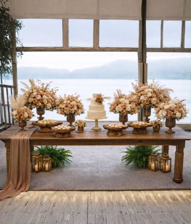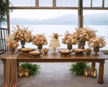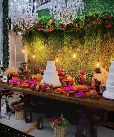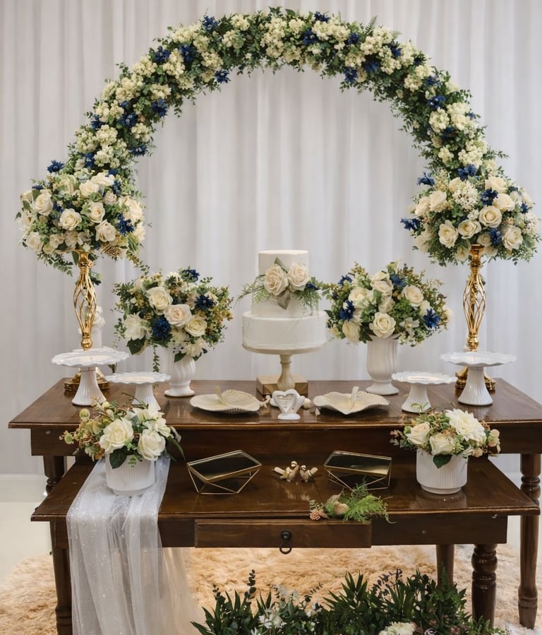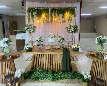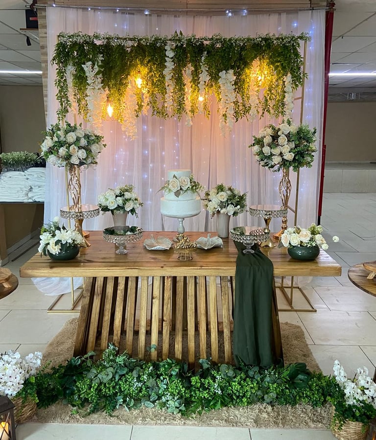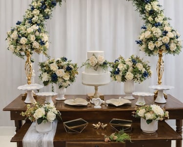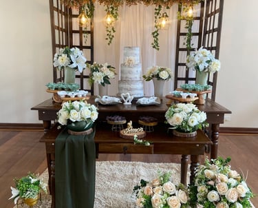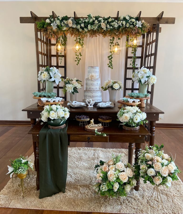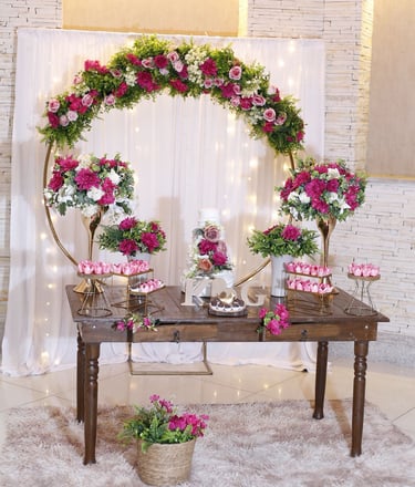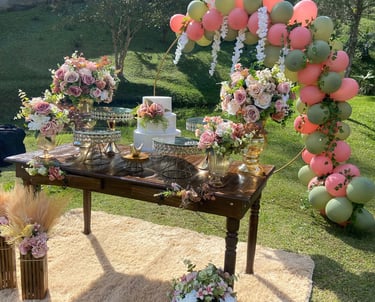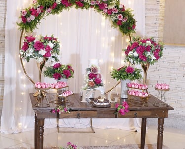 Mesa, arco, e decorativos pensados para dar vida ao seu casamento ou festa de debutante. Cada detalhe pode ser adaptado à sua paleta de cores, criando um ambiente elegante e exclusivo.