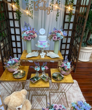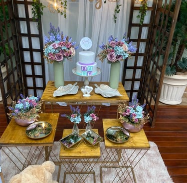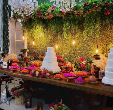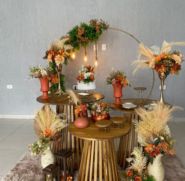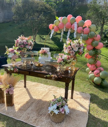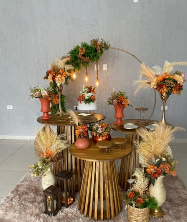 Mesa, arco, pergolado e decorativos pensados para dar vida ao seu casamento ou festa de debutante. Cada detalhe pode ser adaptado à sua paleta de cores, criando um ambiente elegante e exclusivo.